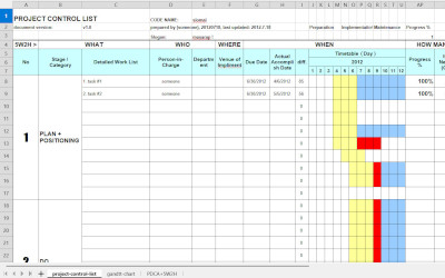 The Project Control List form is designed for those office workers who want to simply handle their project in a easy way dispite that hassle from complicated project management software. All tasks are now listed in the Project Control List as PDCA (in the processes of Plan, DO, Check, Action) and 5W2H (What, When, Where, Who, Why, How many, How much) approches.
