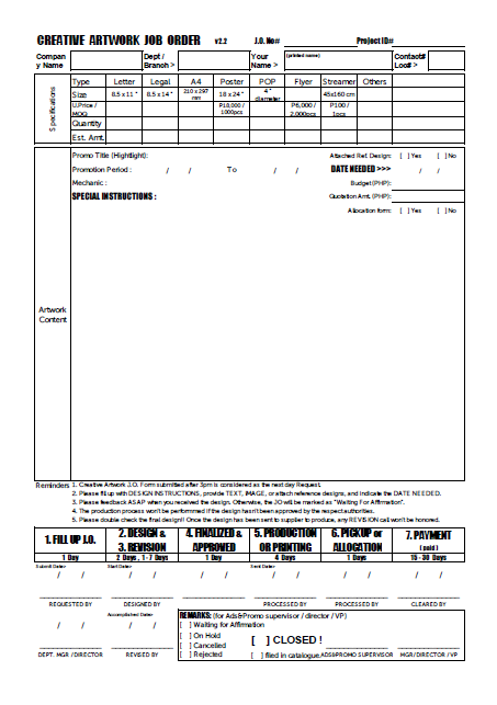 If your company has a design department, and you have alot of artworks to do every day, it's hassle every time to describe your specification of design, then you really need a job order form to assist you to fill up to communicate with designers.