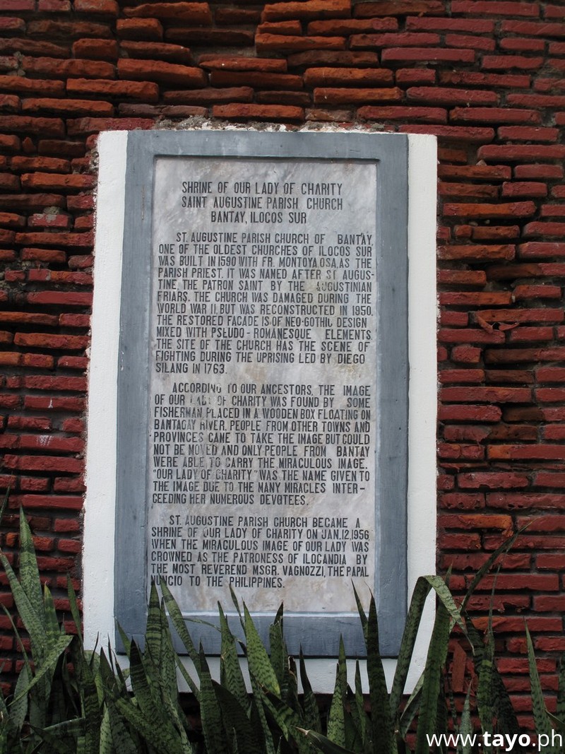 The Saint Augustine Parish Church, commonly known as Bantay Church, is a Roman Catholic church in Bantay, Ilocos Sur in the Philippines. The church was dedicated to St. Augustine of Hippo. It is also known as the Shrine of Our Lady of Charity (Shrine of Nuestra Señora de la Caridad) housing the miraculous image of Virgin Mary as Our Lady of Charity, crowned by the Pope as the patroness of Ilocandia on 12 January 1956.