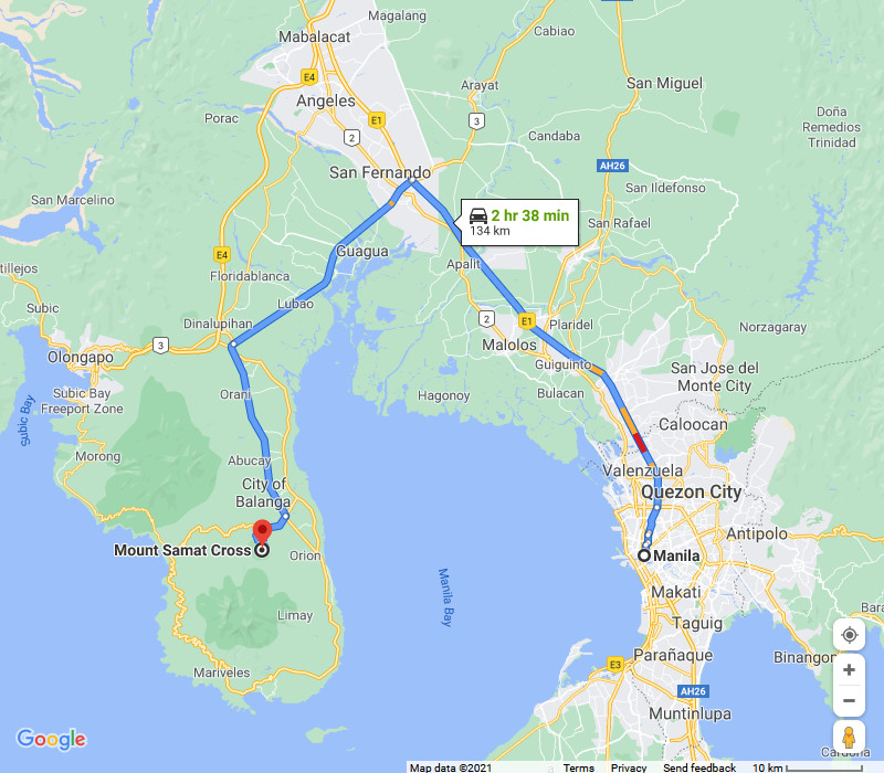 The distance from Metro Manila to Mount Samat Cross is about 134 km and 2 hours 38 minutes.