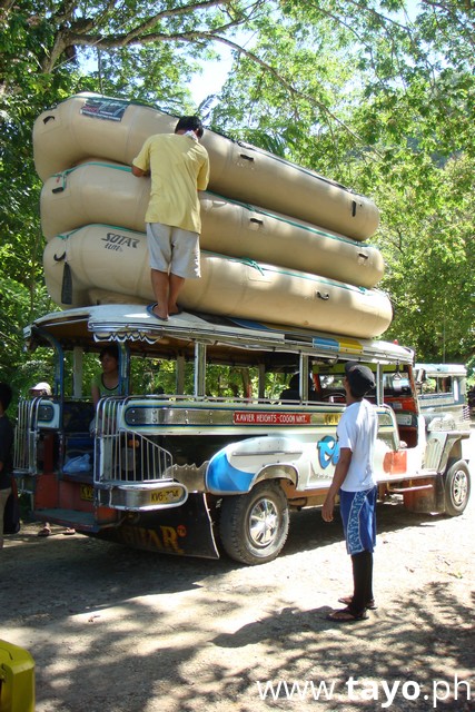 Rafting boat vendor is packing boats on the top of jeepney to the start point of river rafting.