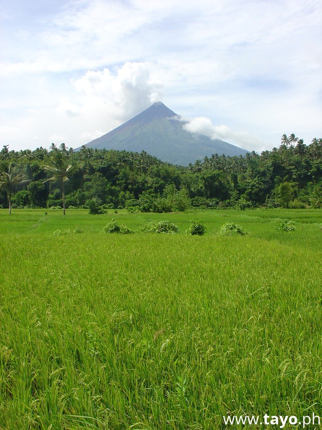 * A far view of Mayon Volcano from an absolutely green rice field and hills...