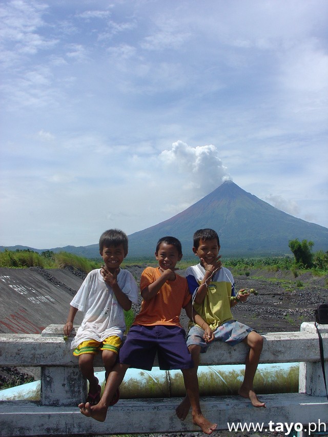 * 3 cute, innocent, and guapo kids take a picture on a bridge in front of the smoking Mayon Volcano.