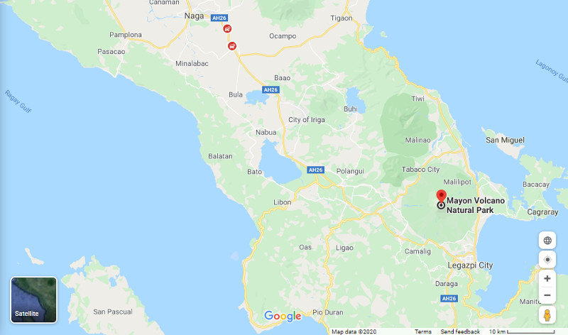 * Google Maps shows the location of Mayon Volcano at Albay province of the southern tail of Luzon Island right besides Legaspi City and Taboco City. It's about 471 kms distance and 13 hours driving from Manila City to Mayon Volcano.