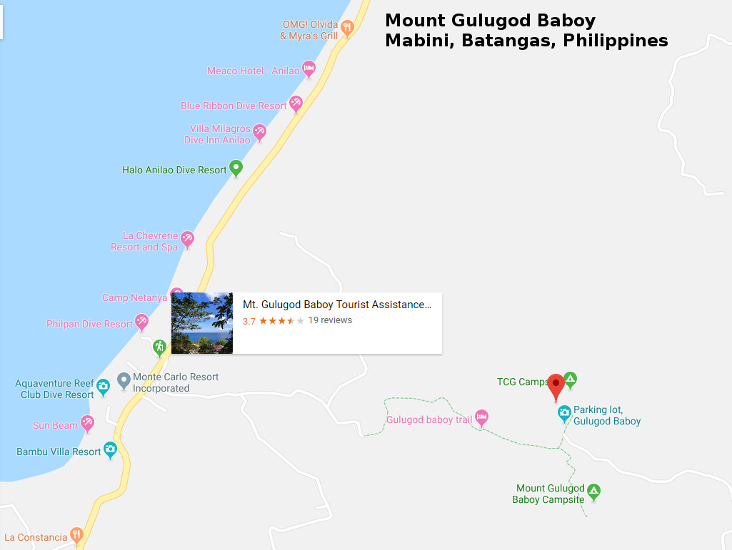* The entrance is near Mt. Gulugod Baboy Tourist Assistance Center near Philpan Dive Resort entrance.