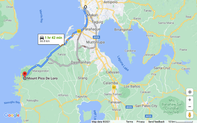 The distance from Metro Manila to Mount Pico De Loro is about 66 kms and 1 hours 42 minutes to go by driving a car.